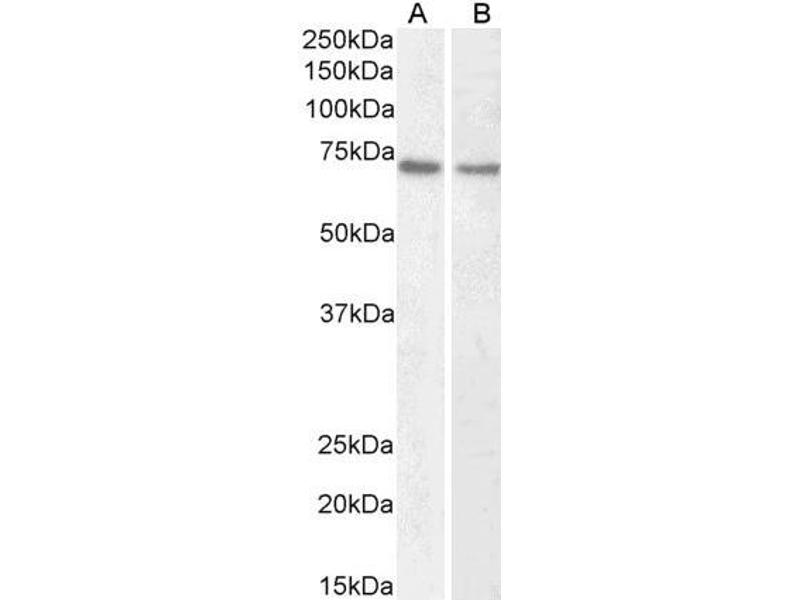 Western Blot: Approx 70 kDa band observed in nuclear lysates of cell lines HeLa and Jurkat and approx. 70-75 kDa in Mouse Liver lysates (calculated MW of 66.4 kDa according to Human NP_005564.1 and 66.8 kDa according to Mouse NP_034851.2) Recommended concen