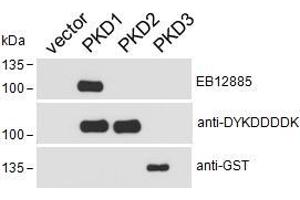 Western Blot: In transfected HEK293 transiently expressing Human PKD1 (DYKDDDDK tagged), a band of approx. 100 kDa is observed. The same band is observed using anti- DYKDDDDK antibody and no bands are observed in cells transiently expressing Human PKD2 or
