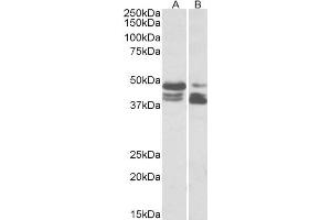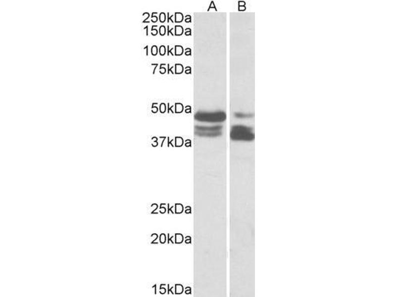 Western Blot: Approx 48 kDa+45 kDa double bands observed in lysates of cell line HeLa and of Human Colon cancer (calculated MW of 47.1 kDa according to NP_NP_005808.3, 46.9 kDa according to NP_001157661.1 and 45.8 kDa according to NP_001157666.1). The observe