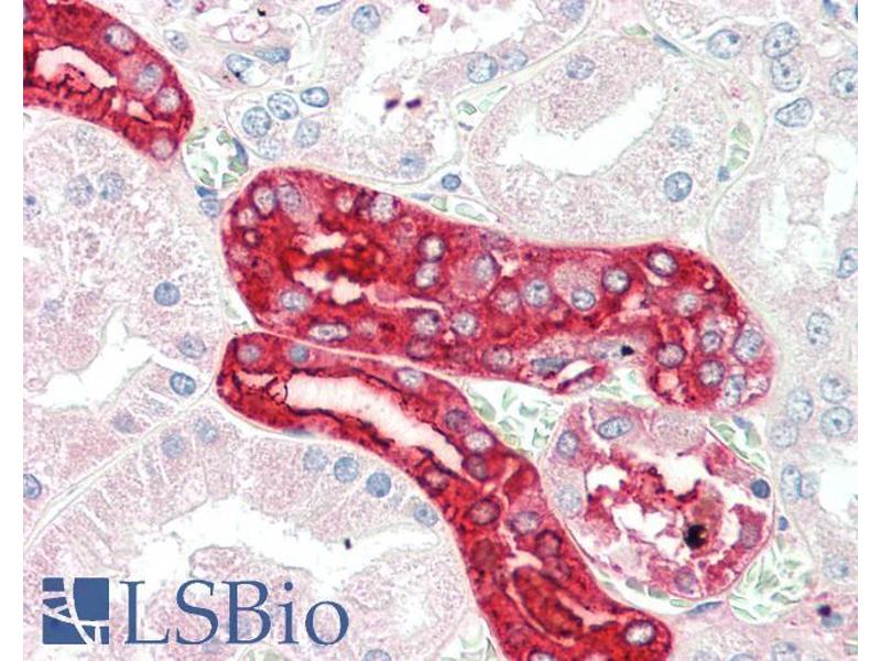 Immunohistochemistry: Paraffin embedded Human Kidney. Recommended concentration: 5 μg/mL.