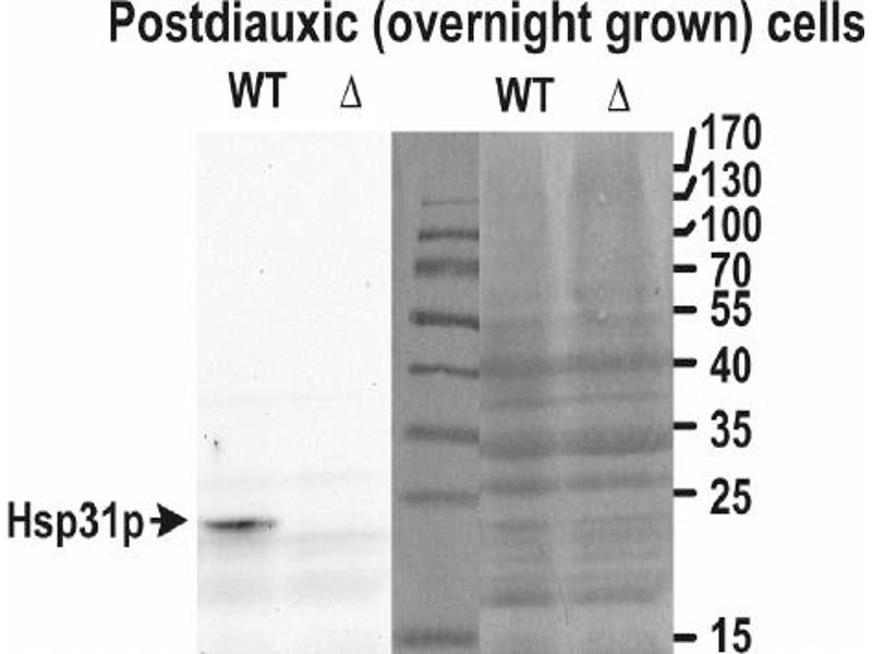 Western Blot: Approx 24 kDa band observed in lysates of postdiauxic (overnight grown yeast cells, and no signal in KO grown under identical conditions. Cells grown in logarithmic phase show diminished signals as expected. (calculated MW of 25.7 kDa accordi