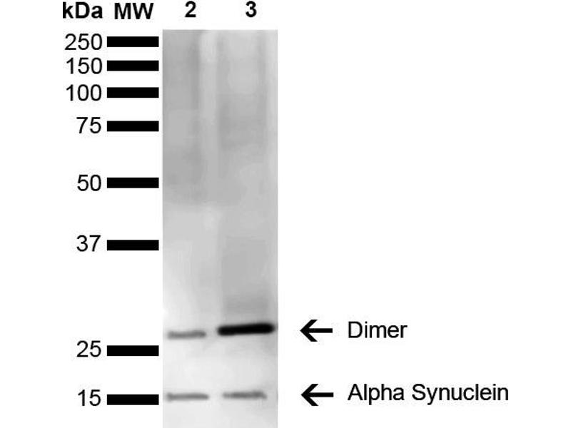 - Expressed principally in brain but is also expressed in low concentrations in all tissues examined except in liver. Concentrated in presynaptic nerve terminals.,Binds within the 81-130 aa region of human ASYN, determined using WB and ELISA with corresponding peptides. Detects ~14 kDa band corresponding to ASYN. Band at ~30 kDa is a dimer.