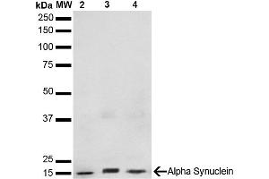 - Expressed principally in brain but is also expressed in low concentrations in all tissues examined except in liver. Concentrated in presynaptic nerve terminals.,Binds within the 101-140 aa region of human ASYN, determined using WB and ELISA with corresponding peptides. Detects ~14 kDa band corresponding to ASYN. Does not detect truncated ASYN (aa 1-114)