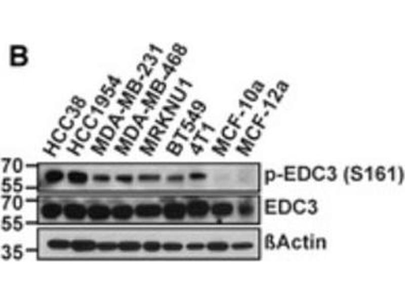 Immunogen: EDC3 affinity purified antibody was prepared from whole rabbit serum produced by repeated immunizations with a synthetic phospho-peptide surrounding the pS161 site of mouse EDC3.
