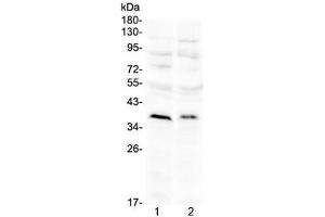 Der Kaninchen Polyklonal anti-ATOH1 Antikörper (ABIN5647595) detektiert spezifisch ATOH1 in WB.