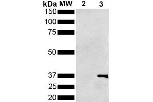 A 1:1000 dilution of ABIN5650668 was sufficient for detection of Metallothionein in 1 μg of purified Pseudomonas aeruginosa Metallothionein (PmtA)-GST tagged protein by ECL immunoblot analysis using goat anti-mouse IgG:HRP as the secondary antibody.