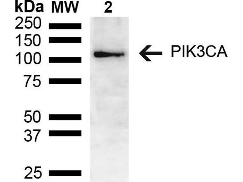 A 1:1000 dilution of ABIN5651074 was sufficient for detection of PIK3CA in 15 μg of mouse brain cell lysates by ECL immunoblot analysis using goat anti-rabbit IgG:HRP as the secondary antibody.