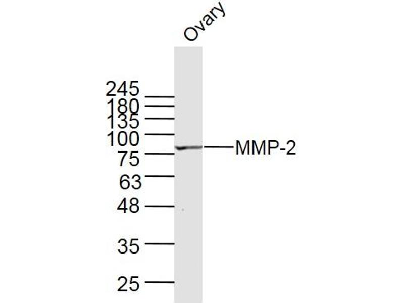 Background: Ubiquitinous metalloproteinase that is involved in diverse functions such as remodeling of the vasculature, angiogenesis, tissue repair, tumor invasion, inflammation, and atherosclerotic plaque rupture. As well as degrading extracellular matrix proteins, can also act on several nonmatrix proteins such as big endothelial 1 and beta-type CGRP promoting vasoconstriction. Also cleaves KISS at a Gly-|-Leu bond. Appears to have a role in myocardial cell death pathways. Contributes to myocardial oxidative stress by regulating the activity of GSK3beta. Cleaves GSK3beta in vitro. Involved in the formation of the fibrovascular tissues in association with MMP14. PEX, the C-terminal non-catalytic fragment of MMP2, posseses anti-angiogenic and anti-tumor properties and inhibits cell migration and cell adhesion to FGF2 and vitronectin. Ligand for integrinv/beta3 on the surface of blood vessels. Isoform 2: Mediates the proteolysis of CHUK/IKKA and initiates a primary innate immune response by inducing mitochondrial-nuclear stress signaling with activation of the pro-inflammatory NF-kappaB, NFAT and IRF transcriptional pathways.