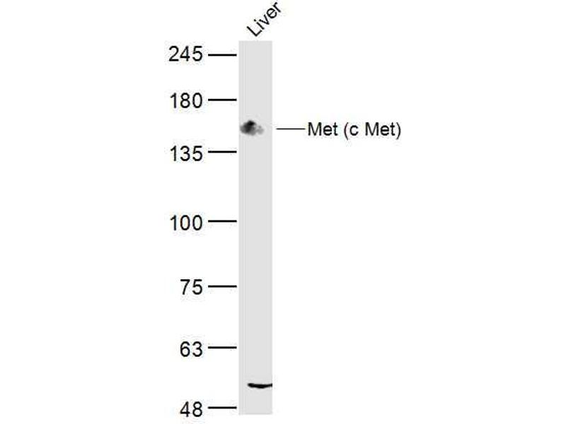 Background: c-Met, a member of the tyrosine kinase superfamily, is the receptor for hepatocyte growth factor, also known as scatter factor (HGF/SF). The mature c-Met protein is a disulfide-linked heterodimer with Mr=190 kDa composed of a heavily glycosylated alpha subunit that is completely extracellular in localization, and a beta subunit comprising an extracellular ligand binding domain, a single transmembrane domain, and a cytoplasmic tyrosine kinase domain. Cells expressing c-Met include epithelial cells, endothelial cells, blood cells of various types, and glomerular mesenchymal cells. HGF/SF binding to c-Met stimulates receptor dimerization and the phosphorylation of numerous residues within the receptors cytoplasmic domain. Signaling proteins that are phosphorylated and/or localized in response to c-Met phosphorylation include: Grb2, Shc, Cbl, Crk, cortactin, paxillin, GAB1, PI3K, FAK, Src, Ras, ERK1 and 2, JNK, PLC gamma, AKT, and STAT3. HGF/SF stimulation of c-Met expressing cells enhances proliferation, migration, morphogenesis, and protease synthesis, characteristics that are associated with invasive cell phenotype. Many types of cancer exhibit sustained c-Met stimulation, overexpression, or mutation, including carcinomas of the colon, breast, ovary, lung, liver, prostate, thyroid, kidney, as well as melanomas and sarcomas. In addition to cancer studies, other research areas in which c-Met is under investigation include organogenesis, organ regeneration, angiogenesis and surgical wound healing.