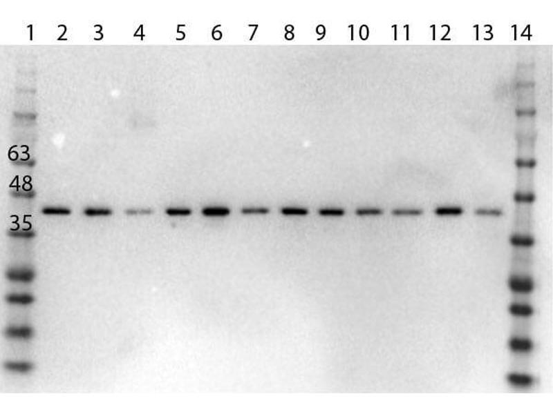 Immunogen: Anti-ERK2 Antibody was produced in rabbits by repeated immunizations with synthetic peptide corresponding to amino acid residues near the C-terminus conjugated to KLH.