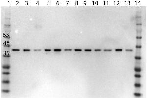 Anti-ERK2 antibody was prepared from monospecific antiserum by immunoaffinity chromatography using synthetic peptide coupled to agarose beads followed by cross adsorption to remove any unwanted reactivity.