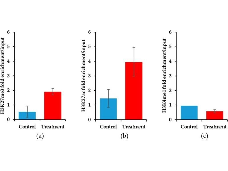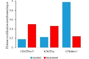 Immunogen: Histone H3 [Trimethyl Lys27, p Ser28] affinity purified antibody was prepared from whole rabbit serum produced by repeated immunizations with synthetic trimethylated/phosphorylated peptides surrounding Lysine 27 and Serine 28 of human Histone H3.