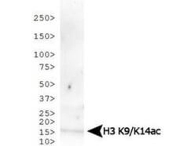 Immunogen: Histone H3 [ac Lys9, ac Lys14] affinity purified antibody was prepared from whole rabbit serum produced by repeated immunizations with a synthetic acetylated peptide surrounding Lysines 9 and 14 of human Histone H3.2.