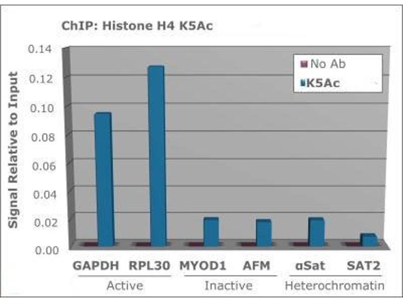 Immunogen: Histone H4 [ac Lys5] affinity purified antibody was prepared from whole rabbit serum produced by repeated immunizations with a synthetic acetylated peptide surrounding Lysine 5 of human Histone H4.