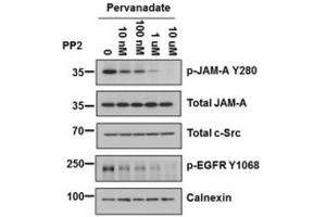 Immunogen: Affinity purified Anti-JAM A pY280 antibody was prepared from whole rabbit serum produced by repeated immunizations with a synthetic peptide corresponding to the c-term and phosphorylated at the tyrosine 280 position of Human JAM A protein.