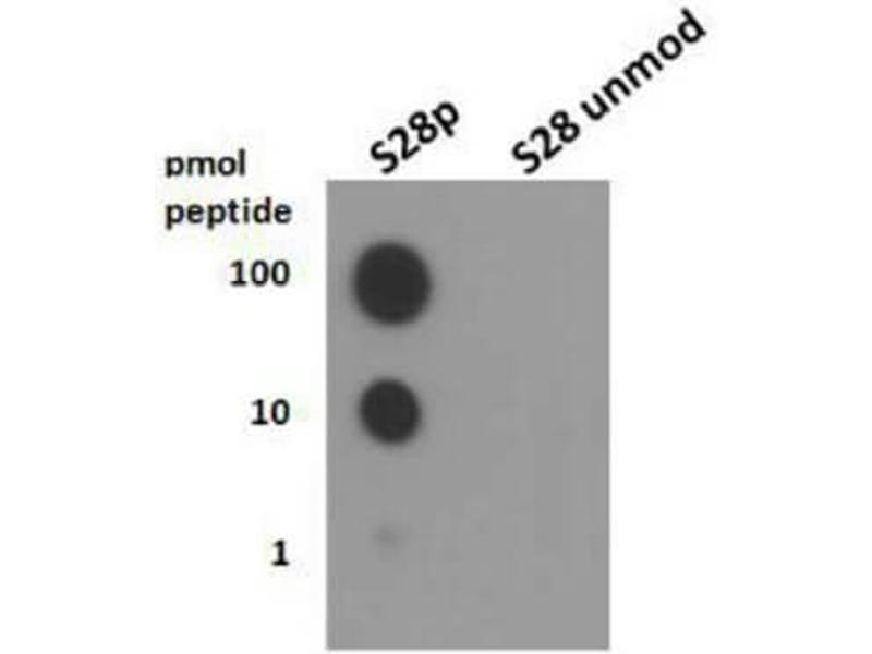 Immunogen: Histone H3 [p Ser28] affinity purified antibody was prepared from whole rabbit serum produced by repeated immunizations with a synthetic phosphorylated peptide surrounding Serine 28 of human Histone H3.