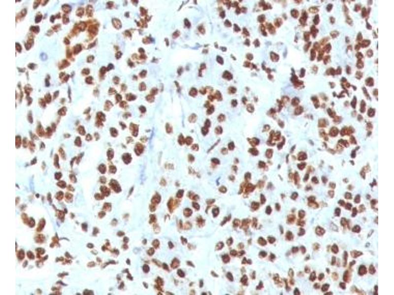 1. The prediluted format is supplied in a dropper bottle and is optimized for use in IHC. After epitope retrieval step (if required), drip mAb solution onto the tissue section and incubate at RT for 30 min.\. Immunohistochemistry (FFPE): 0.5-1 μg/mL for 30 min at RT,Prediluted IHC only format: incubate for 30 min at RT (1) -