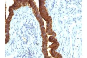 EGP40 is a 40-43 kDa transmembrane epithelial glycoprotein, also identified as epithelial specific antigen (ESA), or epithelial cellular adhesion molecule (Ep-CAM). It is expressed on baso-lateral cell surface in most simple epithelia and a vast majority of carcinomas with the exception of adult squamous epithelium, hepatocytes and gastric epithelial cells. This antibody has been used to distinguish adenocarcinoma from pleural mesothelioma and hepatocellular carcinoma. This antibody is also useful in distinguishing serous carcinomas of the ovary from mesothelioma.