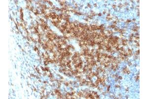 - It recognizes a cell surface glycoprotein of 95/115/135 kDa (depending upon the extent of glycosylation), identified as CD43. 70-90 % of T-cell lymphomas and from 22-37 % of B-cell lymphomas express CD43. No reactivity has been observed with reactive B-cells. So a B-lineage population that co-expresses CD43 is highly likely to be a malignant lymphoma, especially a low-grade lymphoma, rather than a reactive B-cell population. When CD43 antibody is used in combination with anti-CD20, effective immunophenotyping of the lymphomas in formalin-fixed tissues can be obtained. Co-staining of a lymphoid infiltrate with anti-CD20 and anti-CD43 argues against a reactive process and favors a diagnosis of lymphoma.