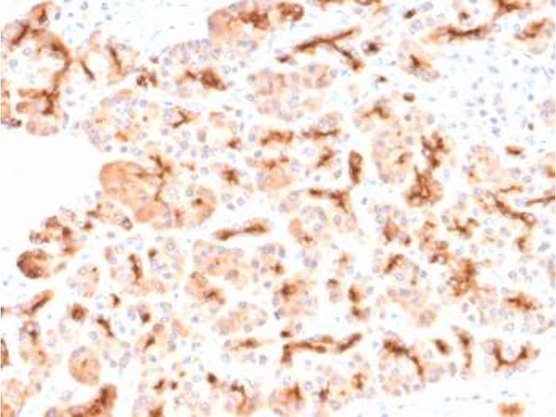 1. The prediluted format is supplied in a dropper bottle and is optimized for use in IHC. After epitope retrieval step (if required), drip mAb solution onto the tissue section and incubate at RT for 30 min.\. Immunohistochemistry (FFPE): 0.5-1 μg/mL for 30 min at RT,Prediluted IHC only format: incubate for 30 min at RT (1)