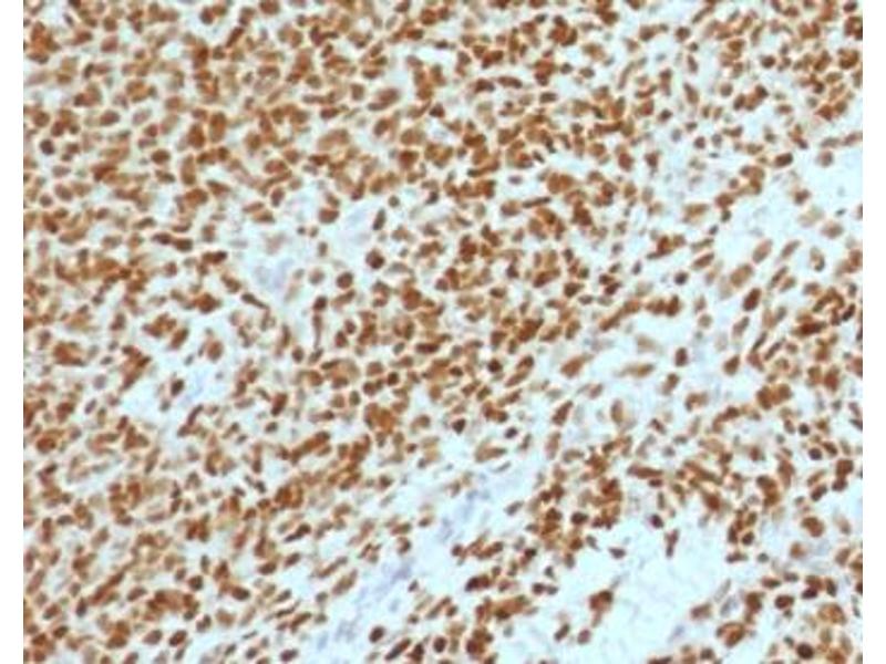 1. The prediluted format is supplied in a dropper bottle and is optimized for use in IHC. After epitope retrieval step (if required), drip mAb solution onto the tissue section and incubate at RT for 30 min.\. Immunohistochemistry (FFPE): 1-2 μg/mL for 30 min at RT,Prediluted IHC only format : incubate for 30 min at RT (1) -