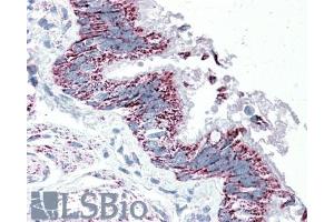 Immunohistochemistry: In paraffin embedded Human Lung shows cytoplasm staining in the resporatory epithelium of the bronchus. Recommended concentration, 5-10 μg/mL.