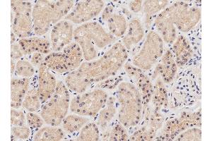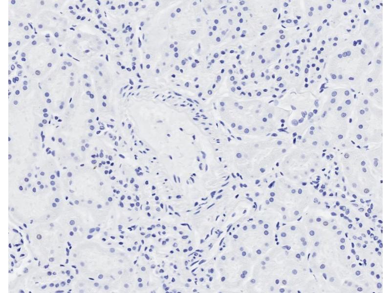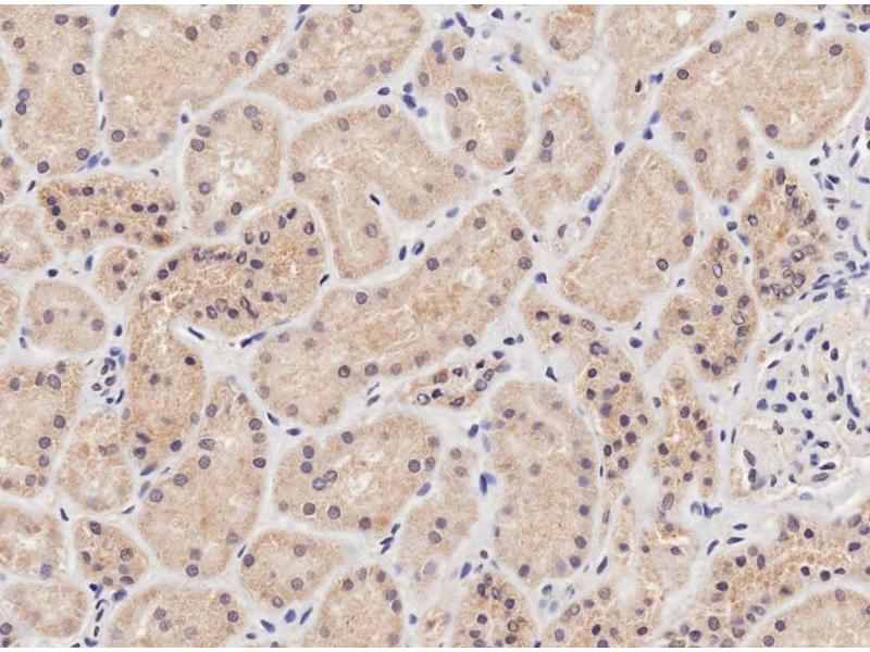 Immunohistochemistry: Paraffin embedded Human Kidney. Recommended concentration: 2 μg/mL.