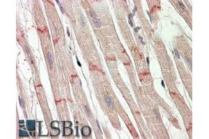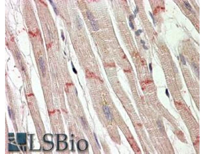 Immunohistochemistry: In paraffin embedded Human Heart shows staining of the junctons between cardiomuscular fibres. Recommended concentration, 3-6 μg/mL.