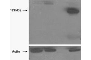 Western Blot: In transfected HEK293 transiently expressing TANK2 a band of approx. 127 kDa is observed. This band is not observed in the non-transfected HEK293. The calculated molecular size is 127 kDa according to NP_079511.1. Recommended concentration,