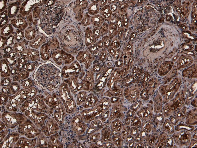 Immunohistochemistry: Paraffin embedded Human Kidney. Recommended concentration: 6-8 μg/mL.