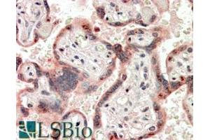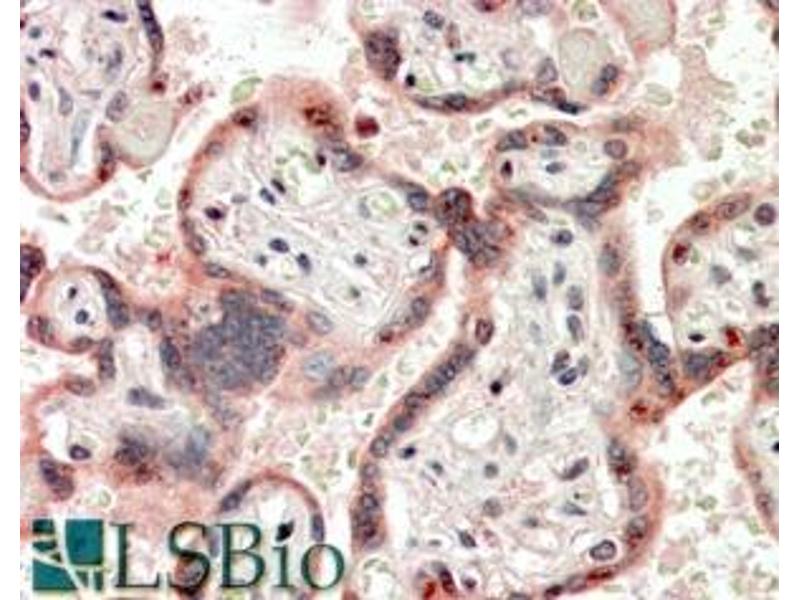 Immunohistochemistry: In paraffin embedded Human Placenta shows staining assocated with nuclei in some trophoblasts and weak cytoplasm staining in cytotrophoblasts. Recommended concentration, 3-5 μg/mL.