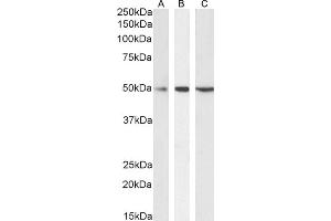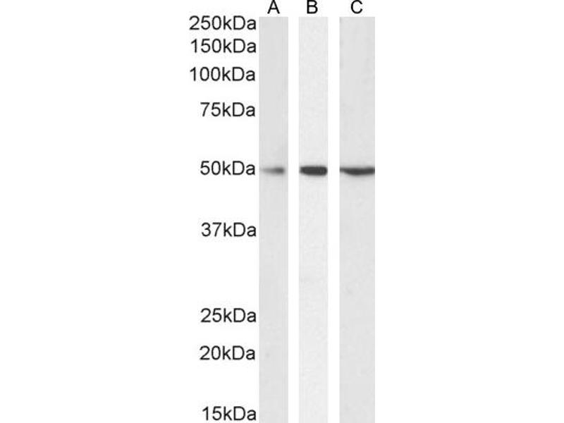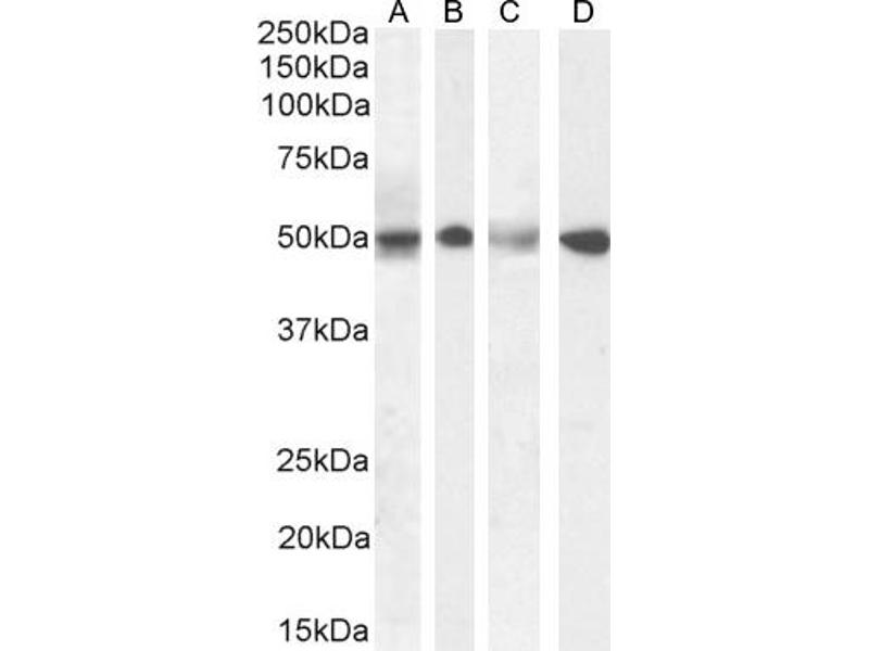 Western Blot: Approx 50 kDa band observed in Human Testis, Duodenum, Kidney and Tonsil lysates, and in lysates of cell lines Daudi, Jurkat and MOLT4 (calculated MW of 49.7 kDa according to NP_055944.2). Recommended concentration: 0.1-1 μg/mL. Primary incuba