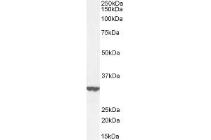 Western Blot: Approx. 30-35 kDa band observed in HepG2 cell lysates (calculated MW of 30.3 kDa according to NP_068839.1). Recommended concentration: 0.1-0.3 μg/mL. Primary incubation 1 hour at room temperature. Preliminary testing was unsuccessful on Rat an
