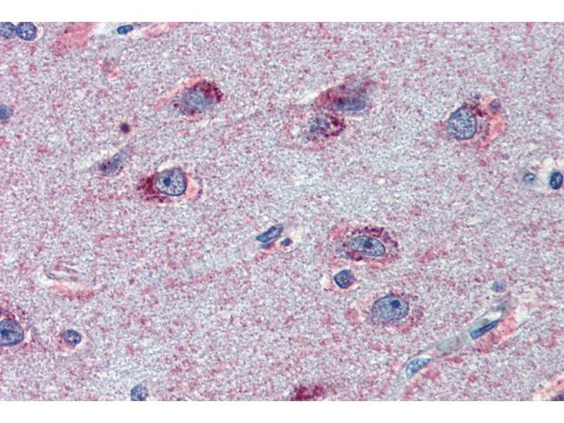 Immunohistochemistry: Paraffin embedded Human Brain (Cortex) and Placenta. Recommended concentration: 2.5 μg/mL.