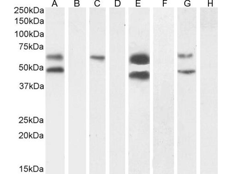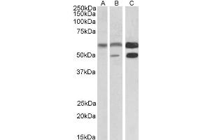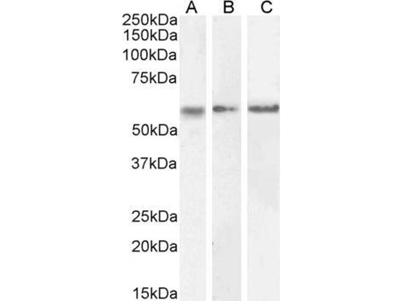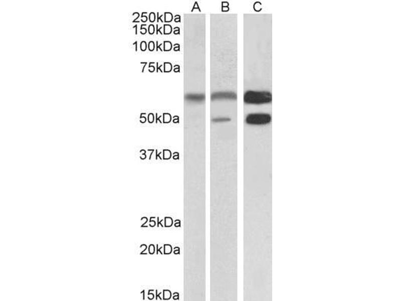Western Blot: Approx 48-50+60 kDa bands observed in Human Cerebral Cortex and Mouse and Rat Brain lysates, corresponding to CAMK2alpha and CAMK2beta respectively and approx. 60 kDa in Human Cerebellum lysates (calculated MW of 55.3 kDa according to Human NP