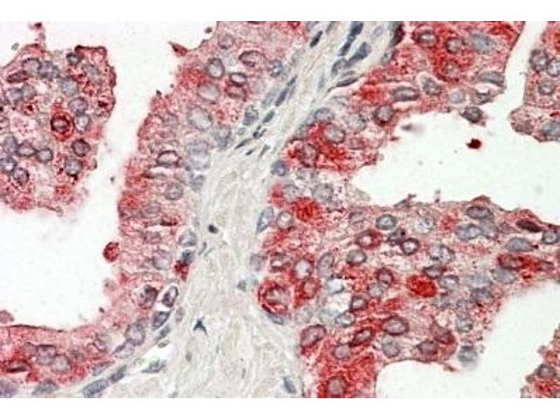 Immunohistochemistry: In paraffin embedded Human Prostate shows cytoplasm staining in some secretory cells of the gland. Recommended concentration, 3-5 μg/mL. This antibody has been successfully used in IHC on Mouse: Nousiainen HO et al. (2014) PMID: 2484
