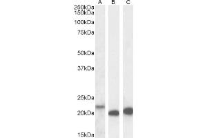 Western Blot: Approx 23 kDa band observed in lysates of cell line HeLa and approx. 21-22 kDa band in lysates of cell lines A431 and U2OS (calculated MW of 22.3 kDa according to NP_001553.1). Recommended concentration: 1-3 μg/mL. Primary incubation 1 hour at