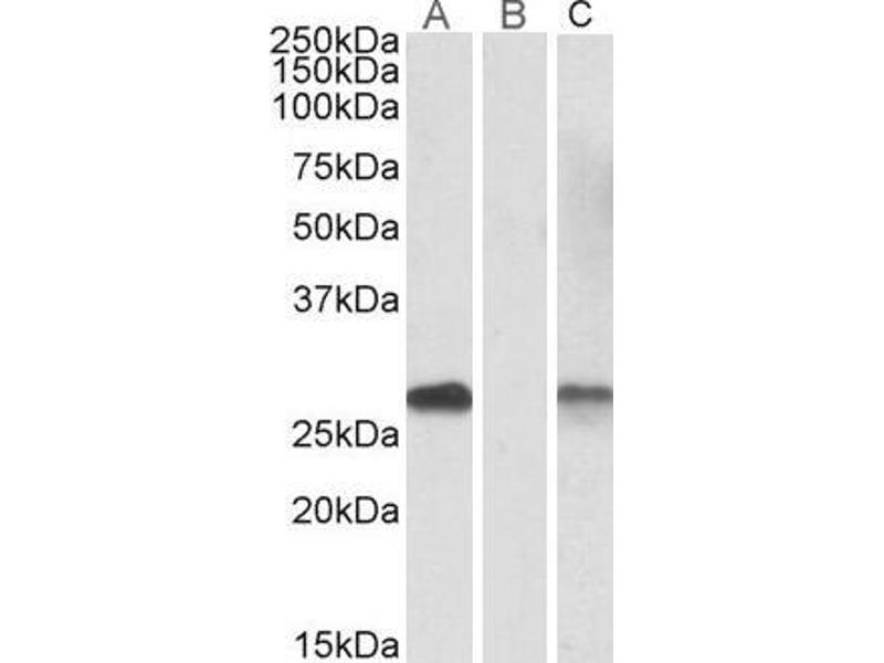 Western Blot: n transfected HEK293 transiently expressing Human DYDC1 (myc and DYKDDDDK tagged), a band of approx. 28 kDa is observed. No bands are observed in mock-transfected HEK293 and the same band is observed using anti-myc tag antibody. This 28 kDa b