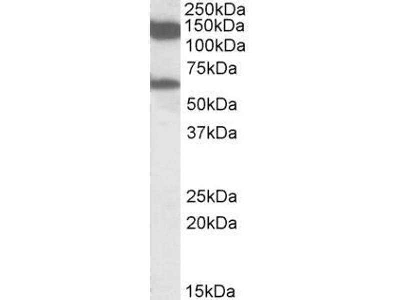 Western Blot: Experiments gave bands at approx 140 kDa and 60 kDa in Rat Testis lysates. These bands correspond to earlier findings with different antibodies from other sources.. This protein has a calculated MW of 109 kDa according to Human NP_004632.1, 10