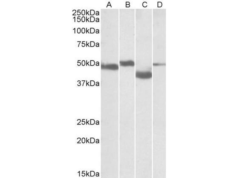 Western Blot: Approx 50 kDa bands observed in Rat Brain and Rat Thymus lysates, 48 kDa band in Mouse Brain and 40 kDa in Mouse Thymus (calculated MW of 51.8 kDa according to Human NP_733775.1 and Mouse NP_001153040.1, and of 43.7 kDa according to Mouse NP_0
