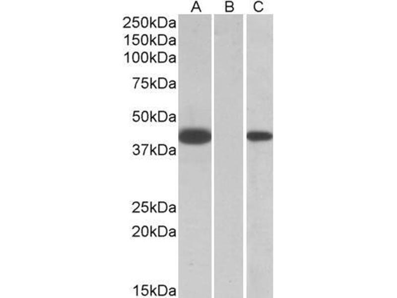 Western Blot: In transfected HEK293 transiently expressing full-length Human FANCF (myc and DYKDDDDK tagged), a band of approx. 40 kDa was observed. No bands were observed in mock-transfected HEK293 and the same band was observed using anti-myc tag antib