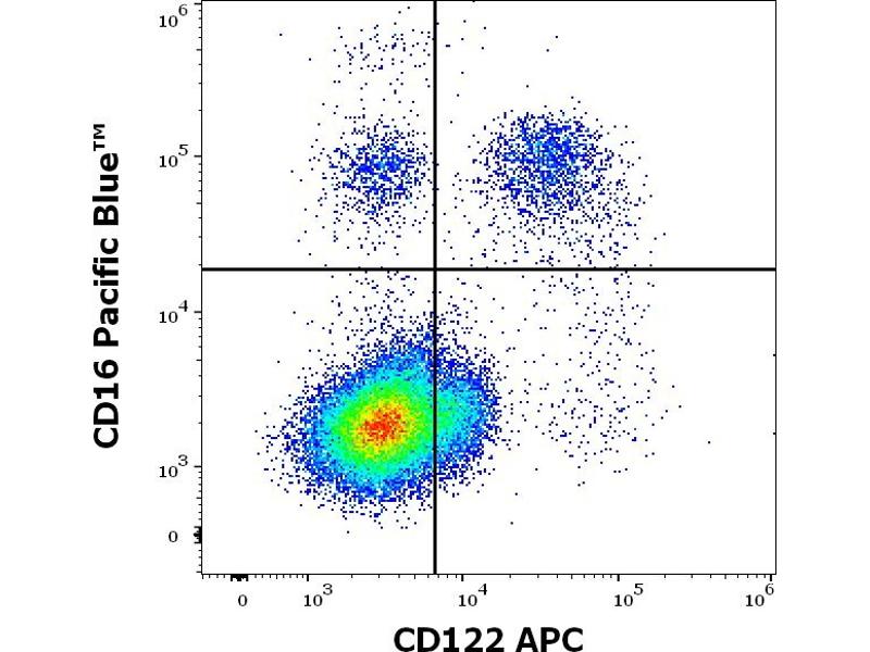 The mouse monoclonal antibody TU27 recognizes an extracellular epitope of CD122 (IL-2R beta), a 70-75 kDa type I transmembrane glycoprotein constitutively expressed by NK cells and a T cell subset, and upregulated upon activation.