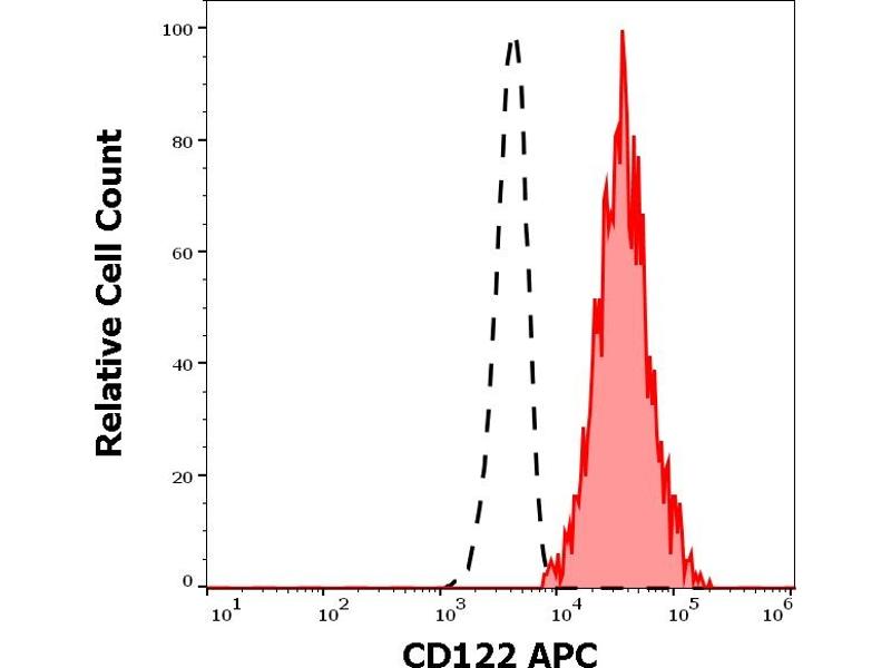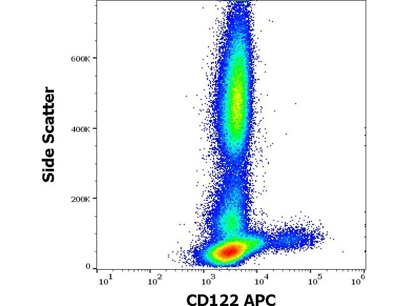 Interleukin 2 receptor subunit beta,CD122 (IL-2/IL-15R beta) constitutes together with CD132 (common gamma chain) and with CD25 (IL-2/IL15R alpha) the intermediate (CD122+CD132) and the high affinity (CD122+CD132+CD25) IL-2 and IL-15 receptor complex. CD122 is expressed on NK cells and lymphocytes, but at low level, unless the cell is activated. The cytoplasmic part of CD122 binds to Src-family and Jak-family kinases. The biological effect of CD122 ligation depends on whether IL-2 or IL-15 is bound to the receptor complex.,IL2RB, IL15RB, P70-75