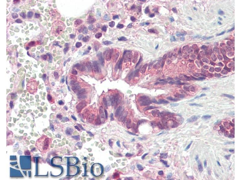 Immunohistochemistry: Paraffin embedded Human Lung. Recommended concentration: 10 μg/mL.
