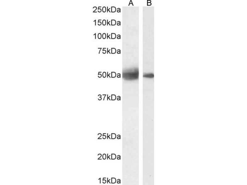 Western Blot: Approx 55 kDa band observed in nuclear lysates of cell lines Jurkat and in LNCaP cell lysates, 50-55 kDa in Human Cerebellum lysates, and approx. 50 kDa in Mouse Brain lysates (calculated MW of 53.0 kDa according to Human NP_536341.1 and 49.4kD