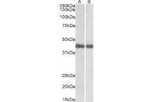 Western Blot: Approx 40+45 kDa bands observed in lysates of cell line HepG2 and 40 kDa in Mouse and Rat Liver lysates (calculated MW of 46.7 kDa according to NP_005887.2). The observed 40 kDa is consistent with observaton with different antibodies from othe