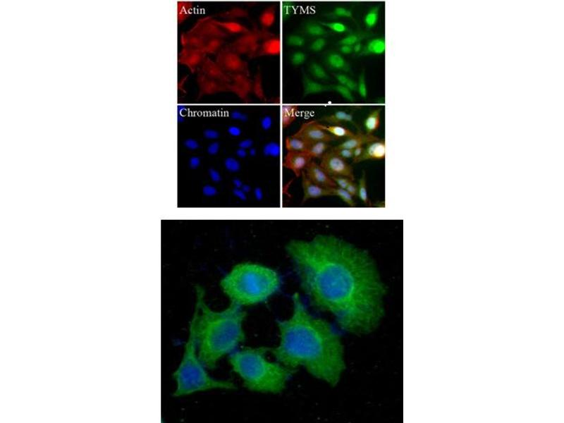 The methylation of deoxyuridine monophosphate (dUMP) to deoxythymidine monophosphate (dMTP) is an essential step for the formation of thymine nucleotides. This process is catalyzed by thymidylate synthase (TS or TYMS). TYMS is an intracellular enzyme that provides the sole de novo source of thymidylate in activity highest proliferating cells. Being the exclusive source of dTMP, TS is also an important target for anticancer agents such as 5-fluorouracil (5-FU). 5-FU acts as a TS inhibitor and is active against solid tumors such as colon, breast, head and neck. TS expression may be useful in predicting overall patient survival, but the prognostic value of TS expression continues to be a subject of investigation for different types of cancers.