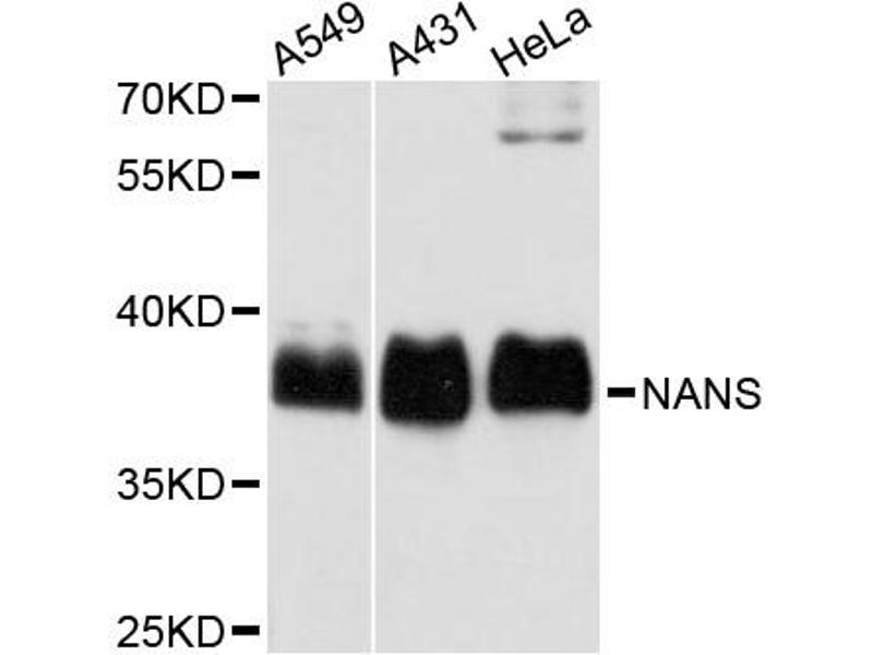 Der Kaninchen Polyklonal Anti-NANS Antikörper wurde für WB validiert. Er ist geeignet, NANS in Proben von Human zu detektieren.