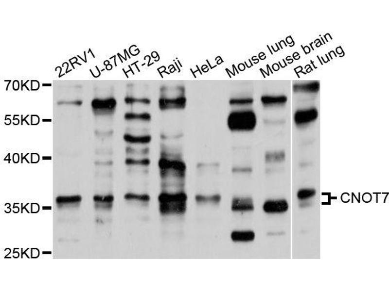 Der Kaninchen Polyklonal Anti-CNOT7-Antikörper wurde für WB validiert. Er ist geeignet, CNOT7 in Proben von Human, Maus und Ratte zu detektieren.