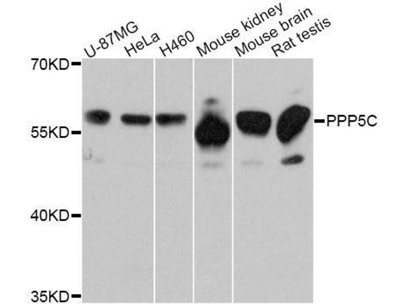 Der Kaninchen Polyklonal anti-PP5 Antikörper wird verwendet zum Nachweis von PP5 in Proben von Human, Ratte und Maus. Er wurde validiert für WB.